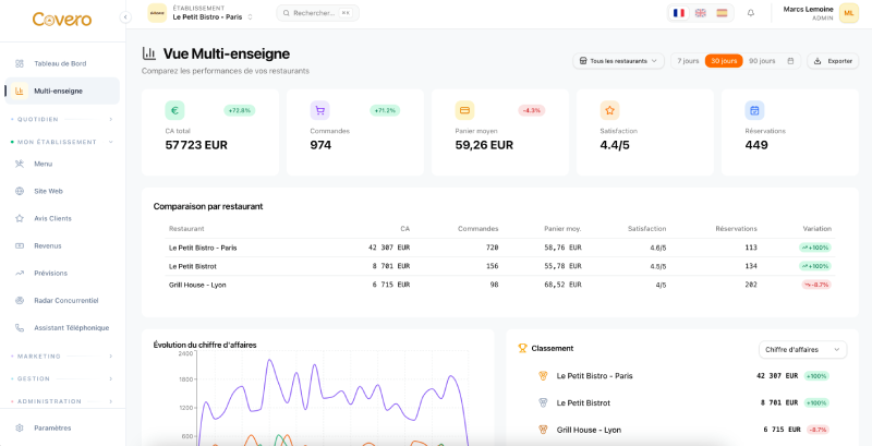Centralized dashboard to compare performance across all your restaurants, detect alerts and manage your network from a single interface.